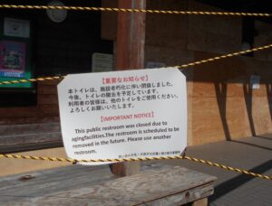 上下水道が接続されていない山中のトイレであり、街なかと同じようにはできませんが、出来る限り、市民・府民に不便をかけないよう、多様な管理者や関係者による善処が求められていることでしょう。