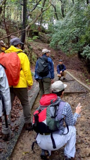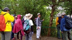昼食後、小雨の中、霧のかかった森を前に樹木の観察を開始。横道に入るとすぐに中瀬校長の説明が始まります。