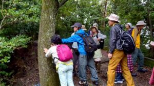 ツツジ、サンキライ、花の終わったモチツツジ、ハウチワカエデ、コバノミツバツツジ、鹿に食べられて樹皮が剥がれたリョウブの木、山道の道端に残るイノシシが掘った跡。ソヨゴ、ネジキ、クリの木、アカマツ。午前の講義で習った動植物達が続々登場します。クスノキの葉をこすって爽やかな香りを嗅いだり、永浜さんの「アベマキとクヌギの違い」の説明を聞いて、コルクのようなアベマキの木肌を触ってみたり。