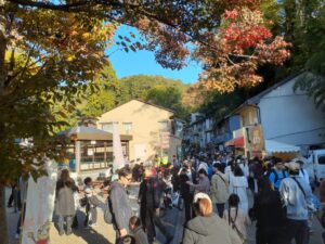 穏やかな好天に恵まれたこの日、紅葉を楽しむ多くの人でにぎわう滝道の足湯(現在休館中)横のふれあい広場で、「ええみのお推進市民の会」のみなさんによる「平成のぞきからくり」が行われました。