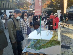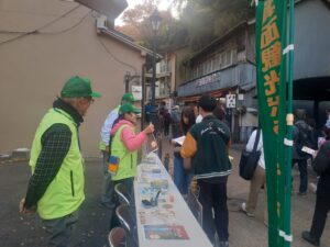 また、のぞきからくりが行われた広場の横では、「箕面観光ボランティアガイド」のみなさんが、特設ミニガイドコーナーを設け、道行く人に、滝道散策ポイントや箕面山ハイキングコースの紹介など、豊かな箕面の自然や歴史をPRしました。