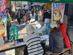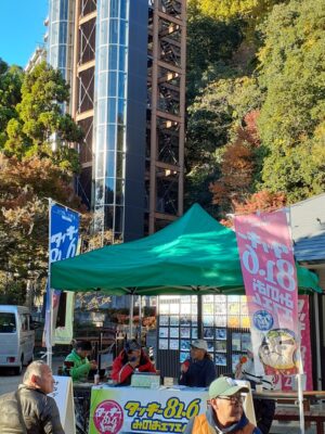 11月30日(土)、紅葉を楽しむ多くの人で賑わう滝道の足湯(現在休業中)横の「ふれあい広場」で、みのおエフエムタッキー816の公開生放送が行われました。