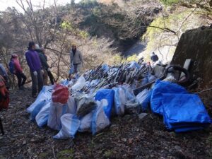 両エリアでは、とくに昨年の夏ごろから、電線の中の銅線を取り除いた外側の被覆部分などの不法投棄が続いていました。今回は、あらかし橋下エリアをパト隊中心にA~Eの5班に分けて大規模な回収作業を実施、持国天橋下エリアは、箕面マウンテンバイク友の会のみなさんが担当しました。