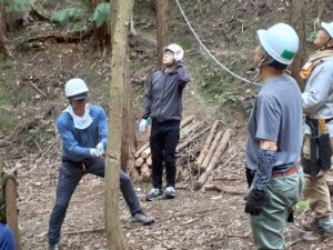 養成講座では、座学と実習を通じて、立ち木の伐倒や倒木処理に関する基本的な技術や安全管理を学びます。