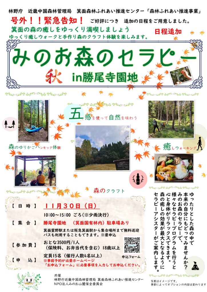 号外!!みのお森のセラピーin勝尾寺園地 11/30(日)日程を追加します。