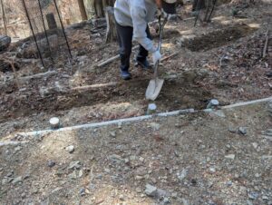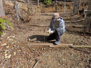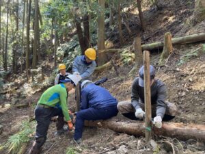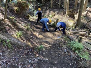 斜面の安定のための土留め作業やハイキング道上の水切りの設置作業を行いました。