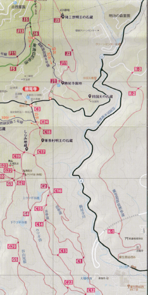 新規の緊急ポイントを含んだ「箕面の山ハイキングマップ」は、箕面ビジターセンターで置いている他、下記の4か所で頒布(10円募金)しています。