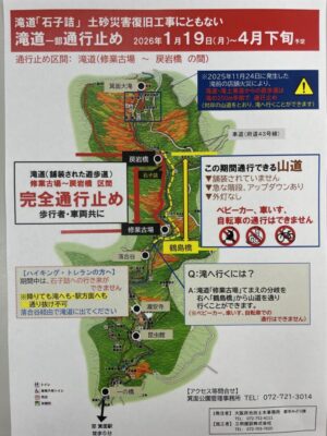 それにともない滝道:修業古場~戻岩橋区間が『完全通行止め』となりますのでご注意ください。