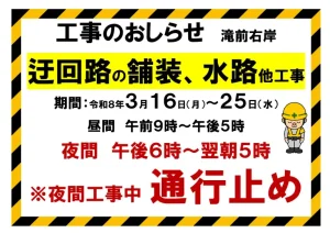 3月16日~3月25日 滝手前右岸(山道)工事のため夜間通行止め(夜間は滝へは行けません)