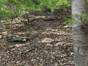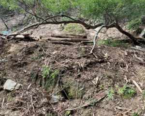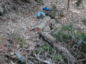 山林整備ボランティア作業は、先ずはそうした倒木整理や危険木の伐倒が中心に進められました。除伐により林内の照度を高めるとともに、倒木は適当な長さに玉切りしたのち、斜面の土留めとして横置きにし、人工林は適度な間伐により根の張りを強くして災害に強い森づりなどを目標に整備が行われました。