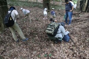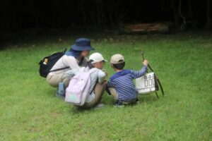 話の後は野外にキノコを探しに出かけます。人数が多いので2つに分かれて政の茶屋園地内を歩き、キノコを見つけると観察したり、採集したりしました。子どもたちは、キノコをゲットしようとあちらこちらを見てまわっていました。大人の方も子どもたちに負けじと一生懸命に探していました。