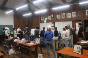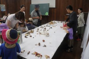 午後2時ぐらいまでキノコを探し歩き、採集したキノコを持ってビジターセンター講義室に戻りました。 講義室では、キノコを机の上に敷いた紙の上に並べ、講師になかま分けをして名前を教えてもらいました。その後、それぞれのキノコの特徴や採集したキノコに関するお話を聞きました。最後に、見分けがとても難しい毒キノコもあり、食べるのはおすすめできないということなどの注意もありました。