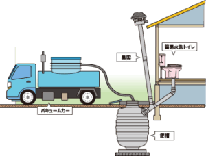 少ない水量(200〜400mL)で流し、便槽に溜めるくみとり式トイレで、バキュームカーで汚物を回収しています。