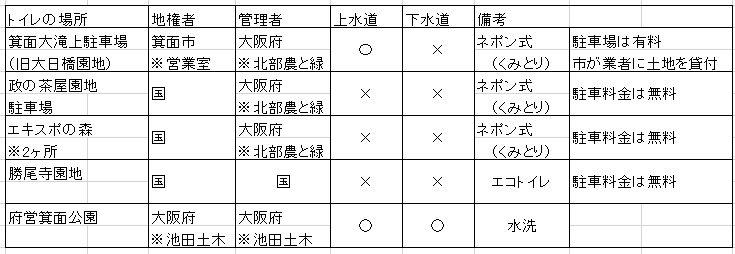 ※府営箕面公園までは、下水道が接続されていますが、箕面大滝上駐車場・政の茶屋園地・エキスポの森・勝尾寺園地には下水道が接続されていません。