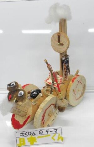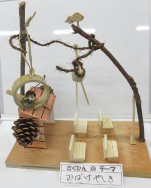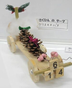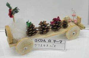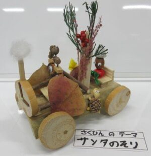 虹のリースや車の上に様々な材料を楽しく飾りつけをしたり、ドールハウスを使った作品もお化け屋敷や秘密の家などになり、思いもよらない子どもたちの工夫がありました。また、この時期ならではのクリスマス、サンタをイメージした作品もありました。