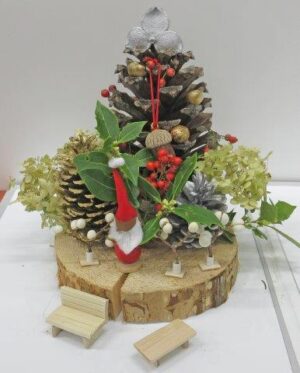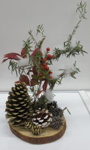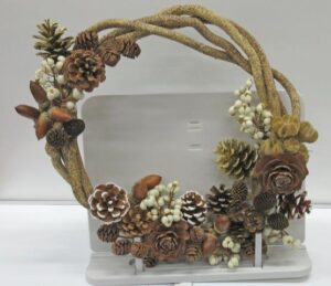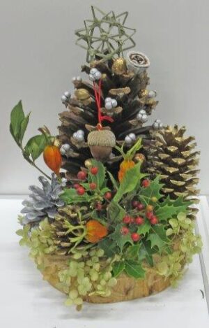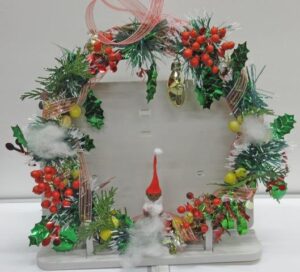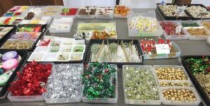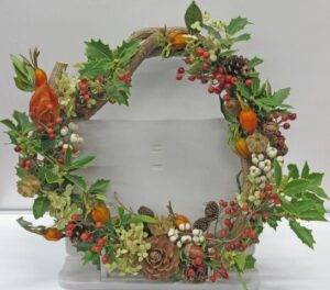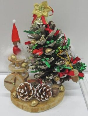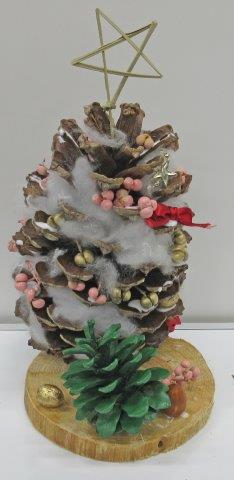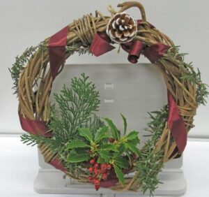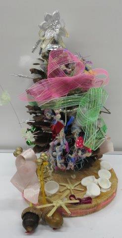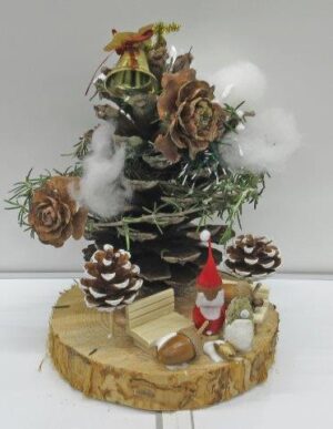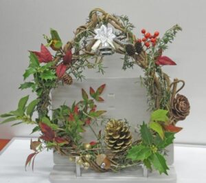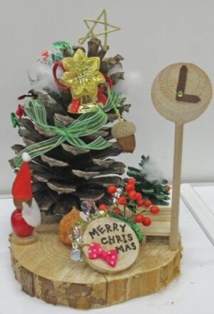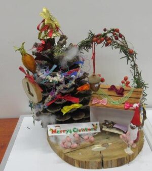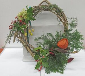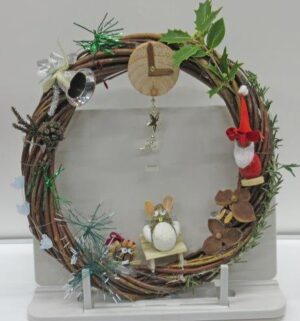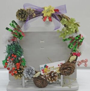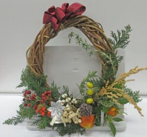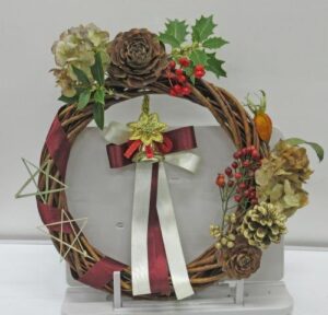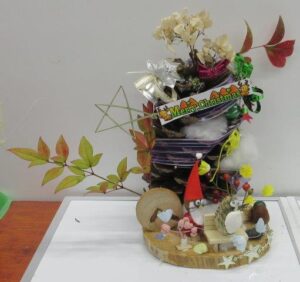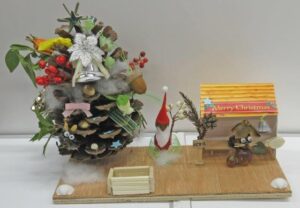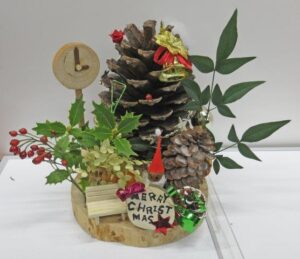 飾り付けの材料としては、毎月第2日曜日の「森の自然工作教室」で用意する材料に加え、クリスマス用として、センダン、ナンテン、ノイバラの実やローズマリー、ヒイラギ、オタフクナンテン、クチナシ、ヒノキ、などの自然素材を準備しました。また、サンタ人形、ベル、星型、リボン、テープ、などクリスマスにふさわしい材料も出しました。大人はおしゃれに、子どもはかわいく、たくさんのの飾り付けを皆さん楽しんで素敵な作品を作りました。それぞれの作品が参加した皆さんのお宅に飾られるのが楽しみです。