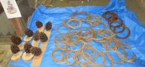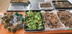 今回は9組、35人の方に参加いただきました。リピーターも多く、毎年人気のイベントです。年に1回開催するこの特別版を待ち望んでいた方もいました。まずはリースまたはツリーのどちらを作るか選びます。ツリーは「ダイオウショウ(大王松)」という松ぼっくりを使います。松の王様と呼ばれるだけあって、15~20cmほどある大きな松ぼっくりです。大人にはリース、子どもにはツリーが人気でした。