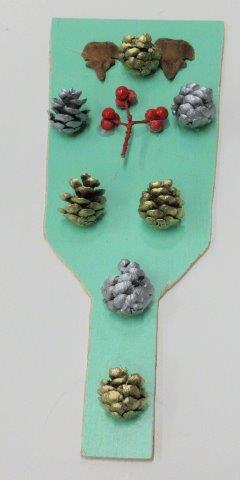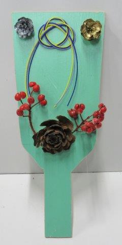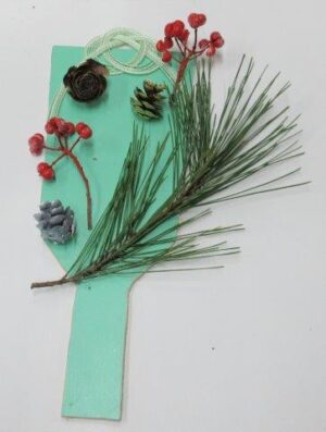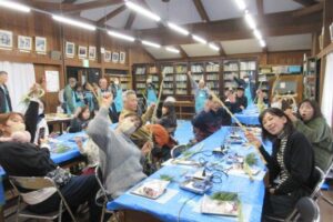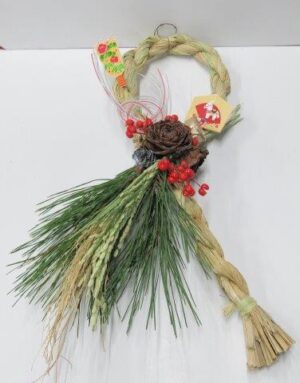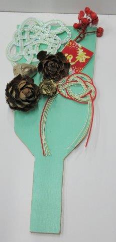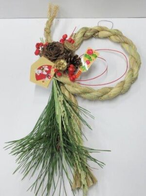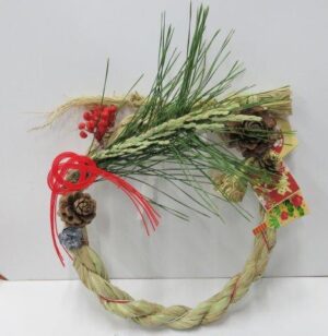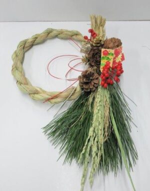 今回は6組、22人の方に参加いただいて、お正月飾りを作りました。まずは、こちらで準備したしめ縄に稲穂、松葉、ハス、シダーローズ、ツガなど、皆さんそれぞれ飾り付けを楽しまれました。同じ材料を使っても皆さんの工夫で個性のあるものができました。