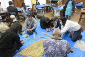 その次には、スタッフの指導で実際にわらを手でねじって、しめ縄を作りにチャレンジしていただきました。初めて縄をなう方も、縄ないに慣れた方も、大人も子どもも、難しいと言いつつ楽しんでおられました。自分で作ったしめ縄を使ってかわいい正月飾りも作ったり、小さな羽子板への飾りつけもした方もおられました。