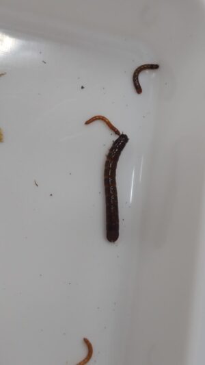 次は朽木の中で越冬中の生きものを探します。釘や金槌を使って朽木を砕きながら中をのぞいていきます。すると、キイロスズメバチ4匹のほか、オオゴキブリ、ミルワームハナムグリ、コメツキ、アギトアリ、キノコムシなどの幼虫を見つけることができました。