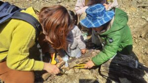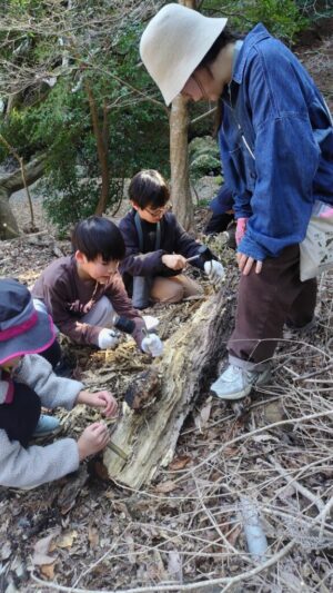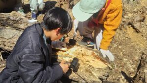 次は朽木の中で越冬中の生きものを探します。釘や金槌を使って朽木を砕きながら中をのぞいていきます。すると、キイロスズメバチ4匹のほか、オオゴキブリ、ミルワームハナムグリ、コメツキ、アギトアリ、キノコムシなどの幼虫を見つけることができました。