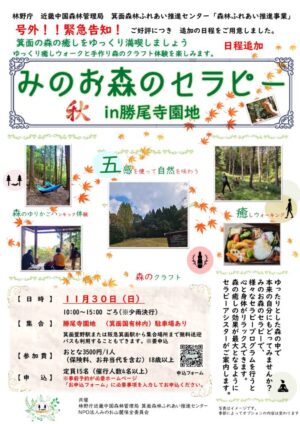 みのお森のセラピー2025年秋 好評につき 10月12日 11月23日に加えて、11月30日(日)の日程を追加で開催することになりました。 このイベントは林野庁ふれあい推進事業のご支援をいただき行っています。 WEV号外20251030林野庁セラピー 【日時】 11月30日(日) 10:00~15:00 ごろ(※少雨決行) 【集合】 勝尾寺園地 (箕面国有林内)駐車場あり 箕面萱野駅…続きを読む
