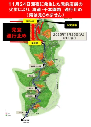 【箕面大滝へは行けません】11/24深夜の滝前店舗の火災により滝道通行止め中(11/25 10:00現在)