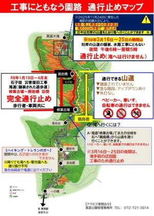 箕面公園管理事務所から、滝前の山側迂回路の夜間通行止めのお知らせです。 なお、滝道の通行に関しては、今回のお知らせ以外にも、修行古場から戻岩橋区間が、1月19日から4月末まで、土砂災害復旧工事のため通行止めとなっています。(ただし、川の対岸の道を使って大滝まで行くことは可能、ベビカー、車いす等は不可) ご注意ください! 滝道の通行規制に関する詳しい問い合わせは、箕面公園…続きを読む