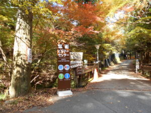 (注記) 箕面ビジターセンターの駐車場は、夜間の駐車及び車中での宿泊はできません。 駐車場の利用時間は、10時から16時までです。 (4月~11月の土日祝日:9時30分~17時) The parking lot of the Minoh Visitor Center is not available for overnight parking or overnight stay in a car. The parking lot is open from 10:00 a.m to 4:00 p.m. (Saturdays, Sundays, and holidays from April to November: 9:30 a.m. to 5:00 p.m.) Thank you for your understanding. 府道入口の案内看板 大滝上駐車場から勝尾寺方面に向かって、左側に入口があり、奥に駐車場があります。